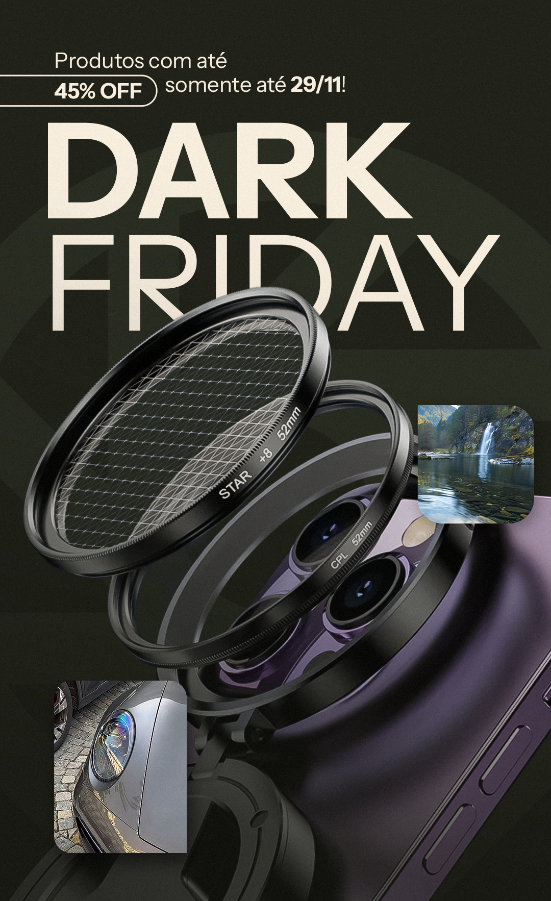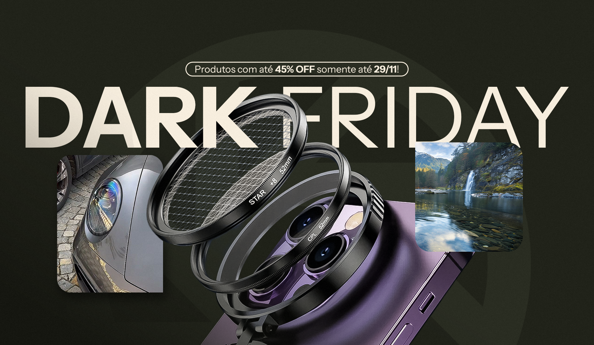 O polarizador DarkLens reduz de forma eficaz o brilho, aumenta o contraste e intensifica a saturação das cores. Aproveite imagens mais claras e detalhes mais nítidos em cada aventura — ideal para fotografar carros escuros, superfícies de água e muito mais.